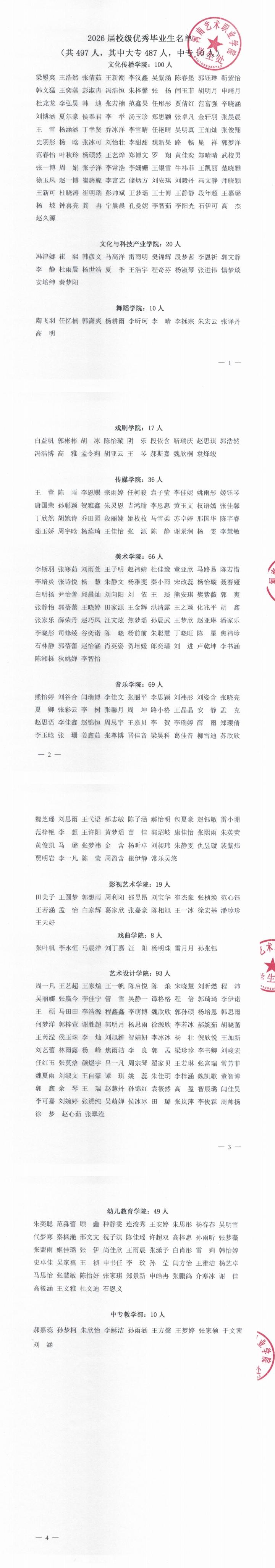 根据我校奖励评定的评选办法,按照公开、公平、公正的原则,经过各班民主评选、各学院推荐、学校审核,拟评选出2026届校优秀毕业生497人。具体名单见附件。